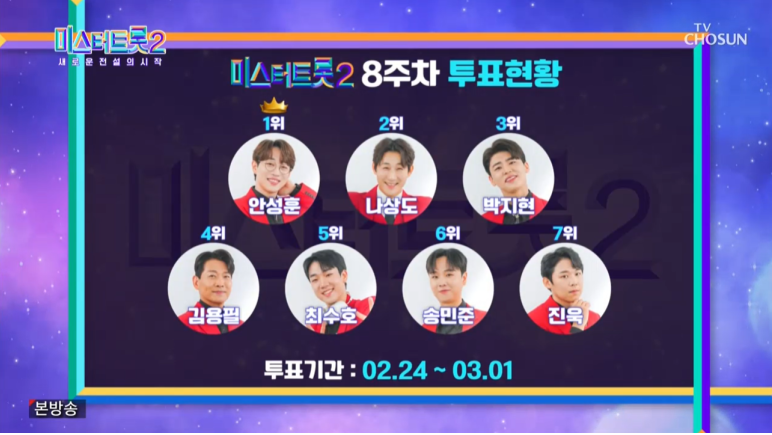 1위 안성훈, 2위 나상도, 3위 박지현이 TOP 3를 차지한가운데 4위 김용필, 5위 최수호, 6위 송민준, 7위 진욱이 8주차 응원투표 TOP 7에 이름을 올렸습니다.