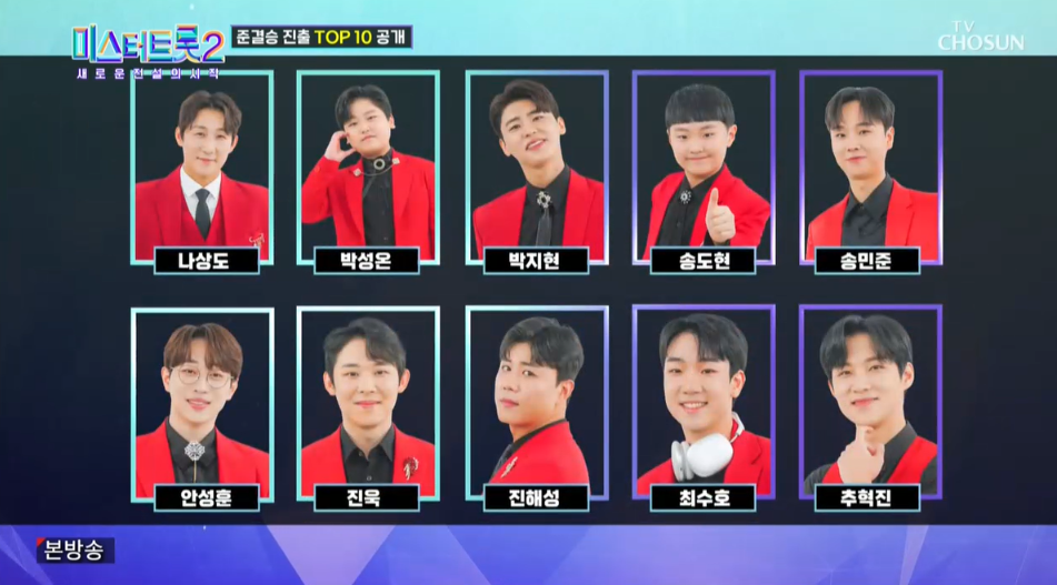 11주 연속 전 채널 1위의 위엄을 달성중인 미스터트롯2는 치열했던 예선과 본선을 거치면서 TOP10이 결정되었습니다. 이제 마지막 관문인 결승진출만을 남겨둔 가운데, TOP7 자리를 놓고 다시 한번 진검승부를 펼치게 됩니다.