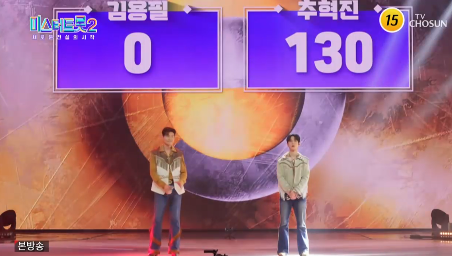 마지막 무대는 카우보이로 깜짝 변신한 김용필, 추혁진이 문희옥의 '평행선'으로 초특급 댄스 트롯 무대를 선보였습니다. 하지만 강력한 우승후보로 꼽히던 김용필이 예상치 못한 실수를 하며 추혁진에 완패했고 추혁진은 강력한 뒷심으로 대이변의 주인공이 됐습니다.